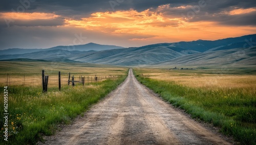 Naklejka premium A country road stretches into a golden sunset over rolling hills.