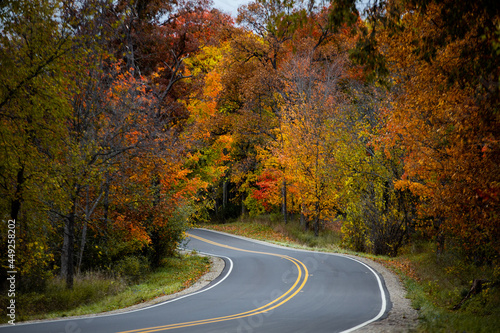© Mark, Obraz premium A countryside road running through a thick forest of autumn fall colored trees in the midwest_05