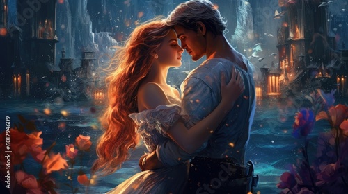© Valeriia, Naklejka premium A couple embraces in a surreal landscape, filled with magic and wonder AI generated.