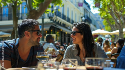 © Chandara, Naklejka premium A couple enjoying wine at a cafe in the city center of Cape Town. stock photo --ar 16:9 --style raw --v 6 Job ID: 73cddb20-0284-4e64-9116-71c000d6cace