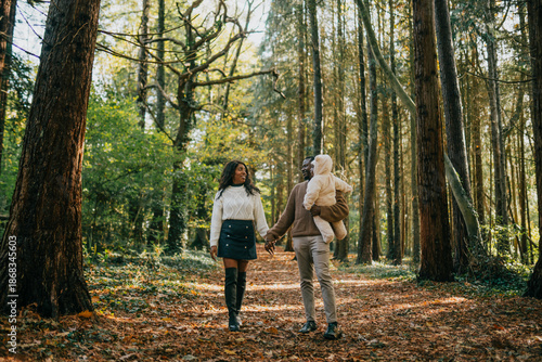 © Reuben, Fototapeta premium A couple holding hands and a baby in a forest. Scene is peaceful and romantic