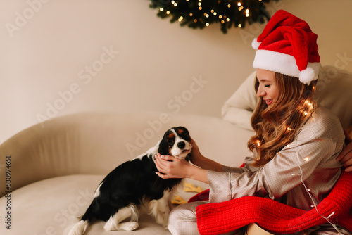 © Елизавета Старкова, Obraz premium A couple in love in red Santa Claus hats hug, give gift gifts and cuddle with a dog puppy in a decorated interior in a cozy room on Christmas Eve at home in winter