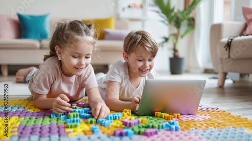 Fototapeta premium A couple is budgeting finances on a laptop while seated on a vibrant play mat filled with colorful building blocks, enjoying their time together in a welcoming living room atmosphere