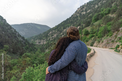 © svetograph, Naklejka premium A couple is hugging each other on a road in the mountains
