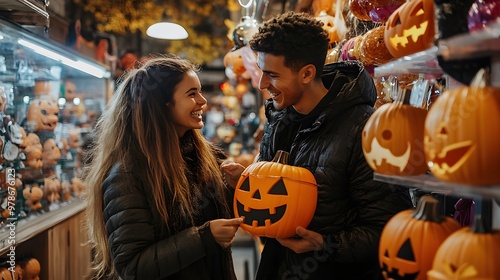 Fototapeta premium A couple laughs while trying on Halloween masks