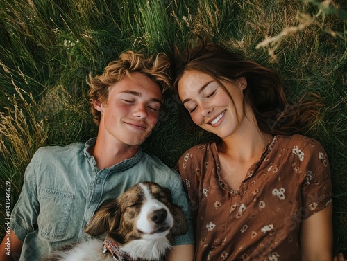 Obraz premium A couple lying on the grass with their dog, both relaxed and smiling,...