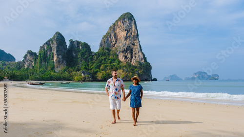 Fototapeta premium A couple of men and women at Railay Beach Krabi Thailand, the tropical beach...