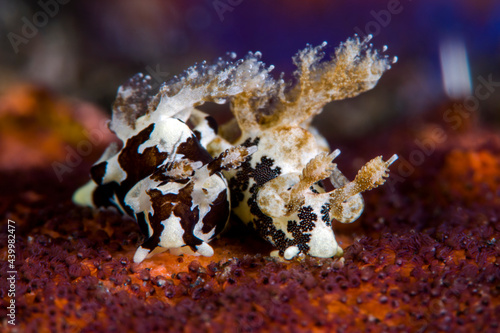 Naklejka premium A couple of sea slugs - Trapania sp. (L) and Trapania euryeia (R) feeding on entoprocts. Underwater macro life of Tulamben, Bali, Indonesia.