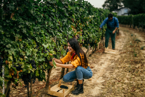 Naklejka premium A couple of workers carefully picking grapes amidst the vineyard rows. Focus...