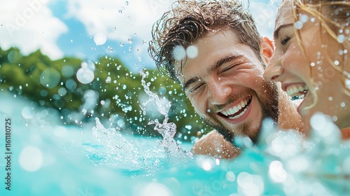 Fototapeta premium A couple playfully splashing each other in a crystal clear lake, their...