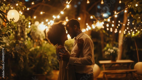 © Galib, Naklejka premium A couple slow dances under string lights in a garden.