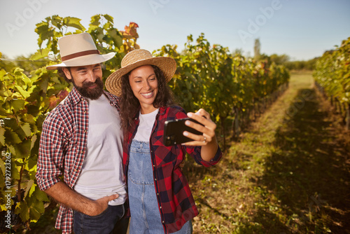 © Stockphotodirectors, Obraz premium A couple stands among lush vines in a vineyard, smiling as they take a selfie on a sunny day. Their joy reflects their passion for family wine production and shared experiences.