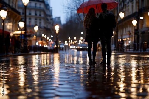 © Milos, Obraz premium A couple stands lovingly together under a red umbrella on a rain-soaked street, their silhouettes creating a beautiful moment of connection amidst the urban ambiance.