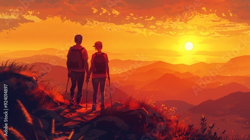 © bcendet, Obraz premium A couple stands on a mountain top looking at the sunset over rolling hills.