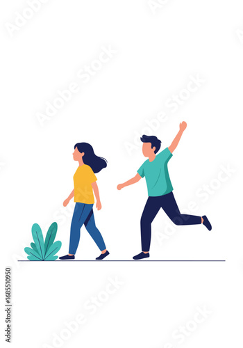 © Jahanara, Obraz premium A couple walking together in a park outdoors with green bushes and trees enjoying a sunny day
