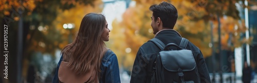 Fototapeta premium A couple walks amidst autumn foliage, capturing the essence of love and...
