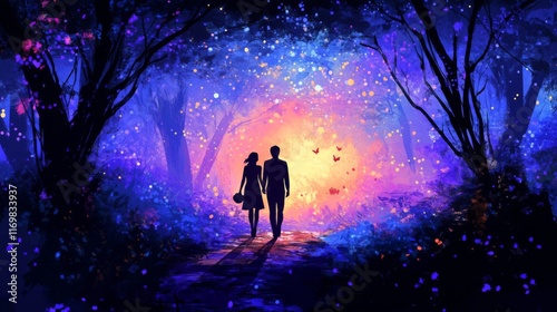 Fototapeta premium A Couple Walks Through A Magical Enchanting Forest