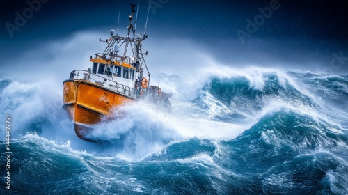 Naklejka premium A courageous fishing boat battles towering waves amidst a stormy sea. The...
