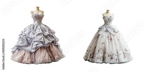 Obraz premium A couture ball gown with voluminous skirt and intricate beadwork, fairy tale style, isolated on white and transparent background