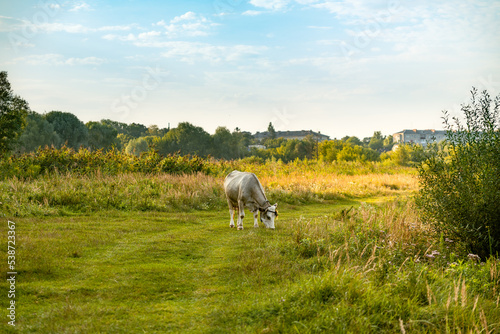 Fototapeta premium A cow freely grazes in the meadow. Free walking