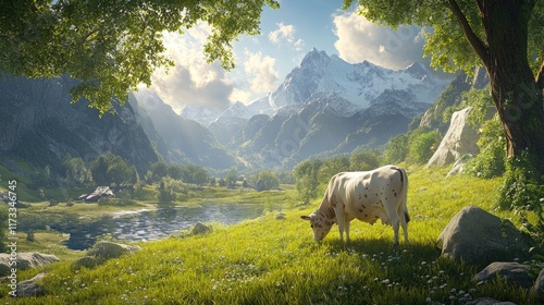 Fototapeta premium A cow grazing peacefully in lush green grass, framed by majestic mountains and under a brilliant sunny sky, capturing rural beauty at its finest