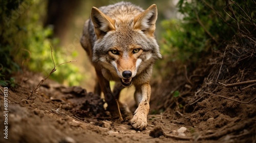 Naklejka premium A coyote (Canis latrans) carries a dead pocket gopher while walking along a hiking trail in Woodland Hills, Los Angeles, California USA