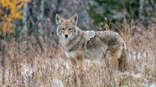 © Formoney, Naklejka premium A coyote is seen standing in tall grass with autumn foliage in the background. The animal looks alert showcasing its natural habitat and seasonal colors.