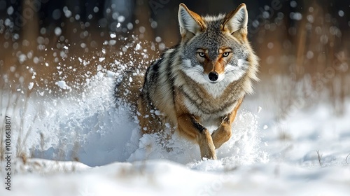 © Hammam, Obraz premium A coyote runs through a snowy field, kicking up snow as it sprints.
