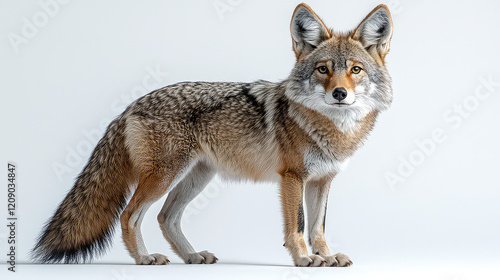 Obraz premium A coyote standing against a white background, showcasing its fur, ears, and tail.