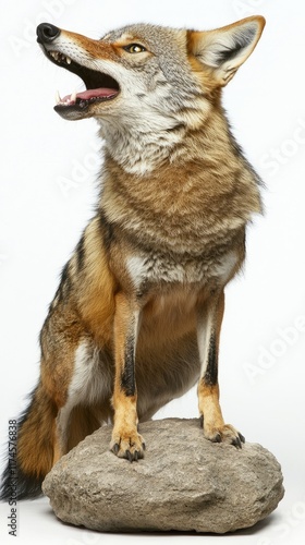 © isti, Fototapeta premium A coyote standing on a rock, showcasing its natural beauty and alertness.