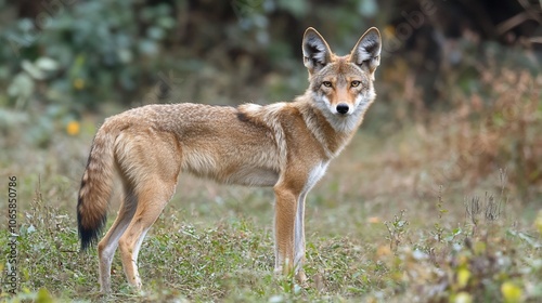 Obraz premium A coyote stands in a grassy field, looking directly at the camera.