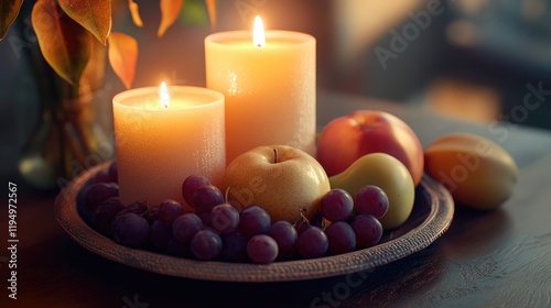 Obraz premium A cozy arrangement of flickering candles and fresh fruits on a decorative...