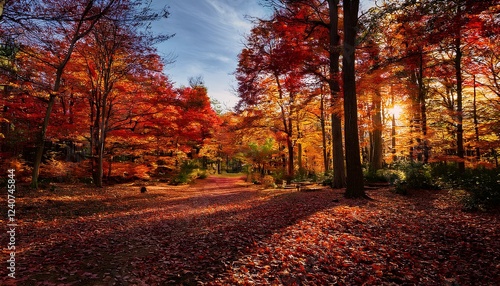 © Ali Adel Mohsen, Naklejka premium A cozy autumn forest with trees displaying vibrant shades of red, orange, and yellow