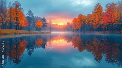 © Shahzad, Naklejka premium A cozy autumn scene by a calm lake, with colorful trees reflecting in the water, the surrounding landscape bathed in the soft light of sunset, creating a warm and inviting atmosphere
