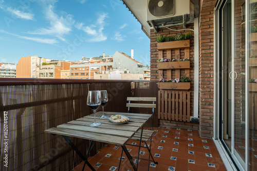 Obraz premium A cozy balcony in Barcelona with a wooden table and two glasses of wine. The...