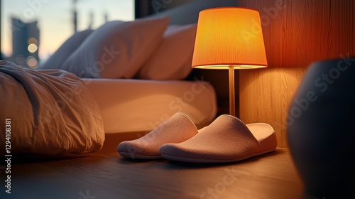 © Leninya, Obraz premium A cozy bedroom scene featuring soft slippers beside a warm lamp, creating a welcoming and relaxing atmosphere.