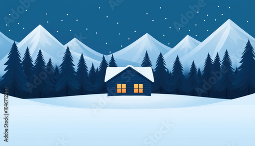 © Wonderful Studio, Fototapeta premium A cozy blue cabin surrounded by snowy mountains and tall pine trees under a starry night sky.