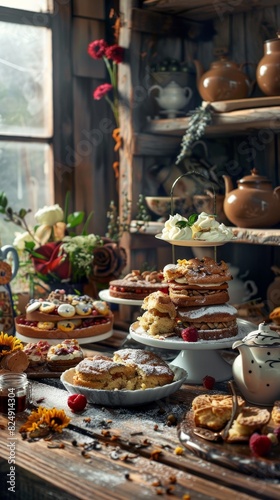 Fototapeta premium A cozy British bakery with a selection of scones, Victoria sponge cakes, and teapots, with a charming countryside decor