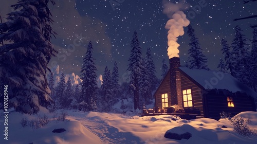 Naklejka premium A cozy cabin covered in snow, nestled in a forest under a starlit sky. Smoke rises from the chimney, and warm light glows from the windows, creating a comforting contrast with the cold night.