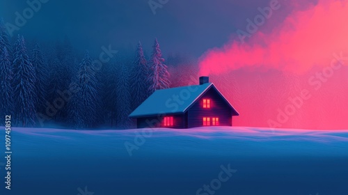 © Naree, Fototapeta premium A cozy cabin in a snowy landscape, illuminated by warm light, surrounded by tall trees and a vibrant, colorful sky.