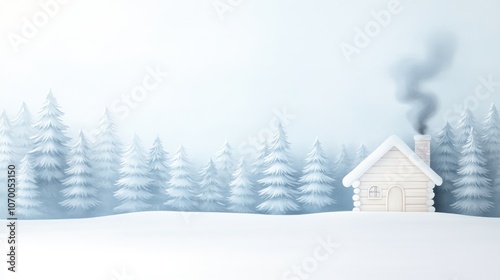 Naklejka premium A cozy cabin in a snowy landscape, surrounded by frosted trees and a gentle plume of smoke rising from the chimney.