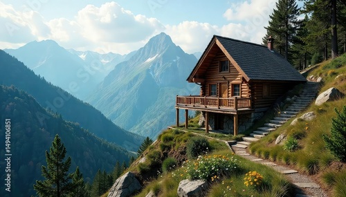 Fototapeta premium A cozy cabin nestled high in the mountains, accessed by a winding, wooden staircase Rustic charm and breathtaking views , ascending, wilderness, wild