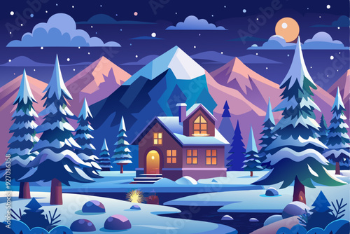 Fototapeta premium A Cozy Cabin Nestled in a Snowy Mountain Landscape Under a Starry Night Sky
