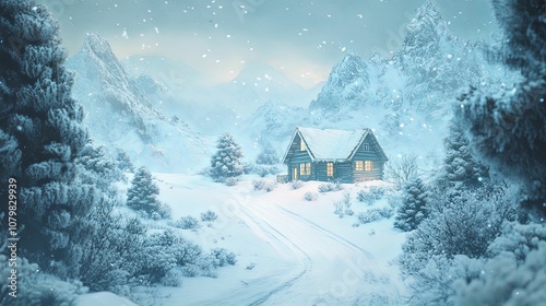 Naklejka premium A Cozy Cabin nestled in a Snowy Mountain Valley