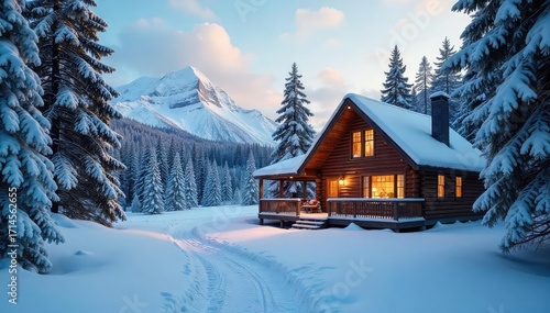 Naklejka premium A cozy cabin nestled in a snowy winter wonderland, perfect for a peaceful and relaxing holiday getaway Enjoy the serene atmosphere and breathtaking scenery , holiday, comfort