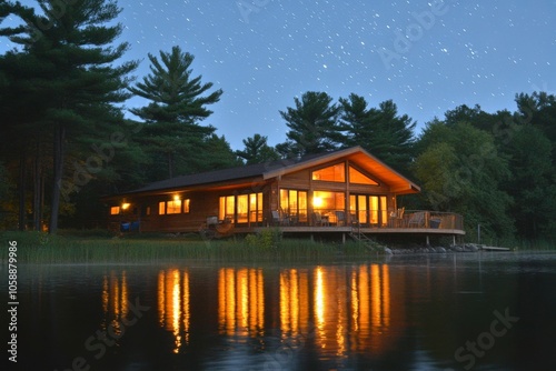 © NURDIYANNA, Fototapeta premium A cozy cabin on the lake under a sky full of stars