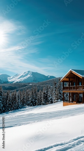 Naklejka premium A Cozy Cabin Overlooks Snowy Mountains and Pine Forests Under Clear Blue Skies