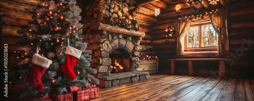 Fototapeta premium A cozy cabin scene featuring a decorated Christmas tree, stockings by the fireplace, and a warm, inviting atmosphere.