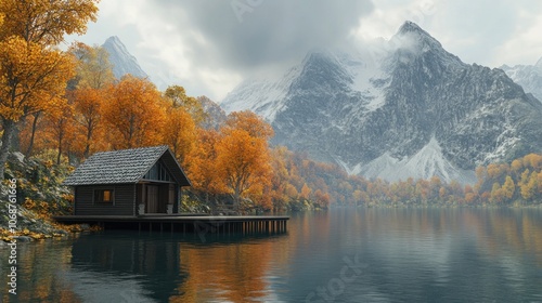 © Fana Art, Fototapeta premium A cozy cabin sits on a lake with fall foliage and snow-capped mountains in the background.