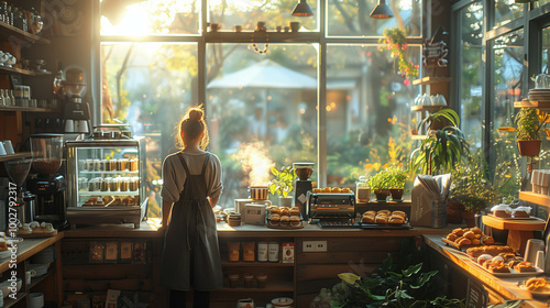 © mankjon, Naklejka premium A Cozy Cafe Interior Bathed in Warm Morning Sunlight